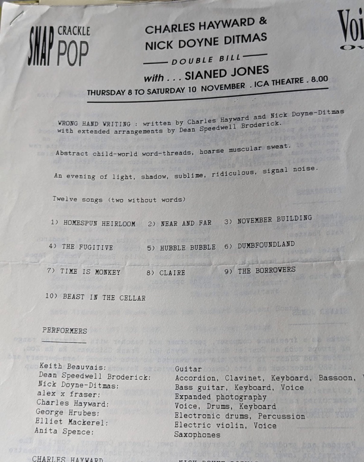 Performers: Charles Hayward, Nick Doyne-Ditmas, Sianed Jones, Keith Beauvais, Dean Speedwell Broderick, Alex X Fraser, George Hrubes, Elliot Mackerel, Anita Spence