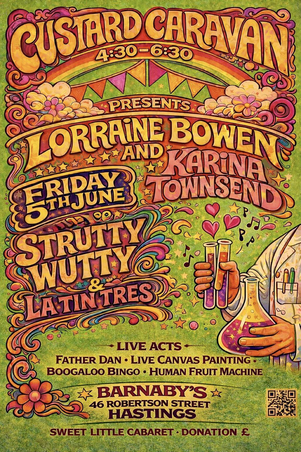 Notes: Custard Carvan is a delightfully innovative art house platform every first Friday bimonthly at Barnabys 4.30- 6.30 pm April 3 June 5 Aug 7 Dec4 (Oct 29 7 pm) Viva original concepts, performative artistic expressions. We invite the experimental & unusual
